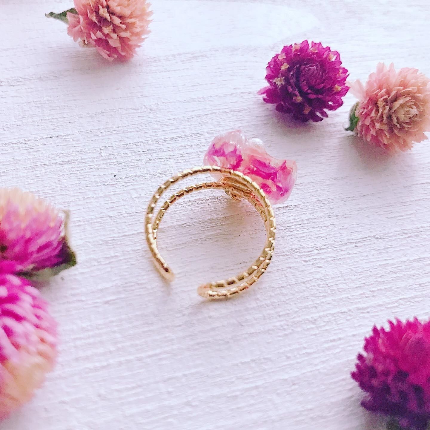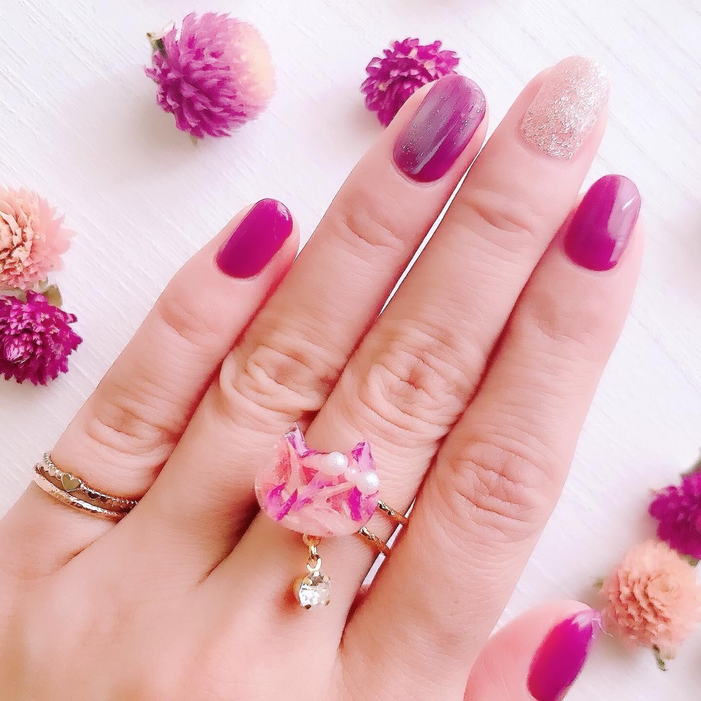 千日紅のドライフラワーを埋め込んだ猫のリング✧*。